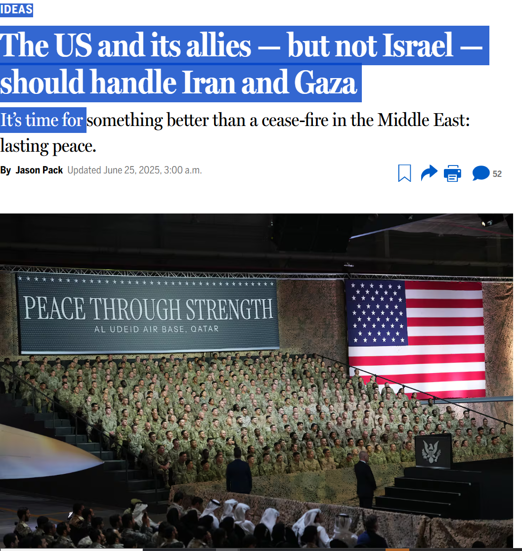 From Boston Globe: The US and its allies — not Israel — should handle Iran and Gaza. SUBHEADING: Now is time for something better than a ceasefire in the Middle East: lasting peace.